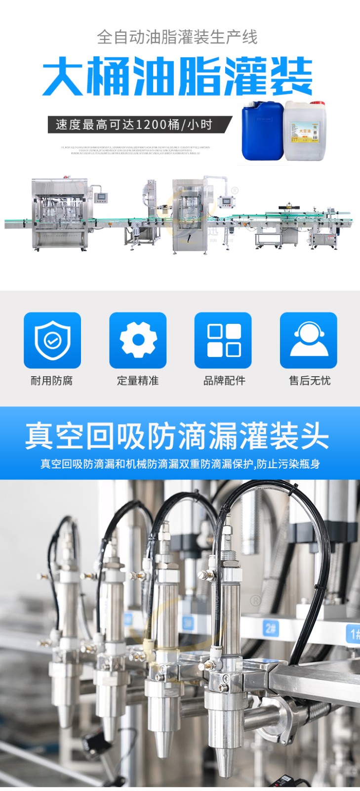 全自動油脂灌裝生產線適用于灌裝各種油類及粘稠液體,如花生油、調和油、菜籽油等食用油的灌裝。可根據灌裝需求定制機型。