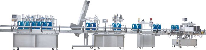 灌裝機+提蓋理蓋機+旋蓋機+鋁箔封口機+貼標(biāo)機