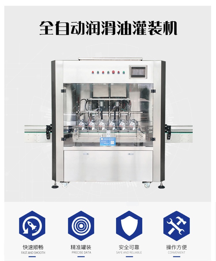 該六頭柱塞式全自動(dòng)潤(rùn)滑油灌裝機(jī)獨(dú)特的灌裝頭設(shè)計(jì)及真空回吸系統(tǒng),確保灌裝過(guò)程無(wú)殘油滴漏,快慢雙速灌裝,灌裝速度可調(diào),杜絕溢瓶現(xiàn)象。