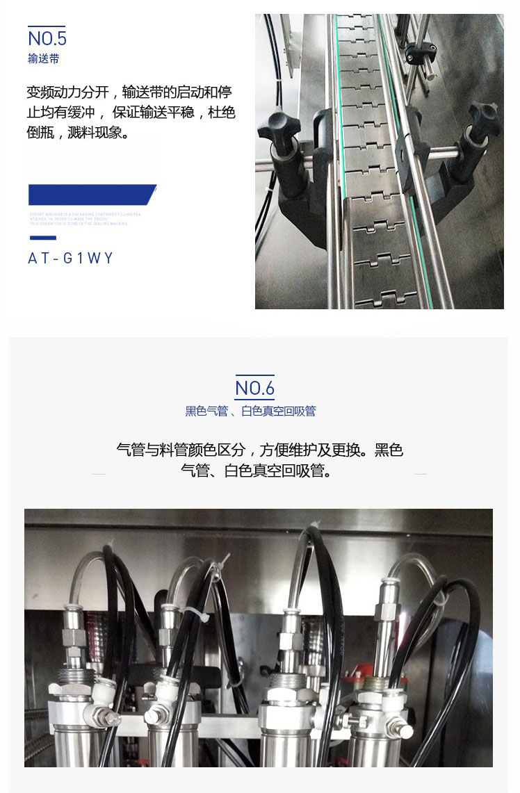 該六頭柱塞式全自動(dòng)潤(rùn)滑油灌裝機(jī)特的灌裝頭設(shè)計(jì)及真空回吸系統(tǒng),確保灌裝過(guò)程無(wú)殘油滴漏,快慢雙速灌裝,灌裝速度可調(diào),杜絕溢瓶現(xiàn)象。該機(jī)采用動(dòng)力灌裝,無(wú)需配裝高位罐,簡(jiǎn)化了安裝工序,提高了灌裝效率。履帶式壓蓋機(jī),穩(wěn)定無(wú)噪音,無(wú)空壓現(xiàn)象。觸摸屏界面友好,操作簡(jiǎn)捷,SIEMENS PLC控制系統(tǒng),運(yùn)算速度快,性能穩(wěn)定,品質(zhì)卓越。電、氣件均采用精品元件,確保整機(jī)運(yùn)作穩(wěn)定。