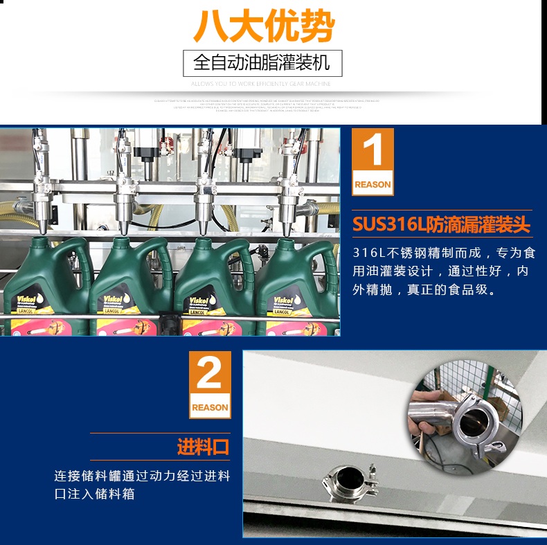 1.防滴漏灌裝頭由SUS316L不銹鋼精制而成,專為食用油灌裝設(shè)計(jì),通過性好,內(nèi)外精拋,真正的食品級.