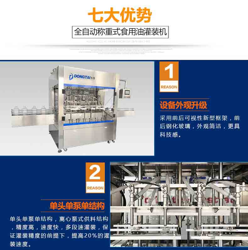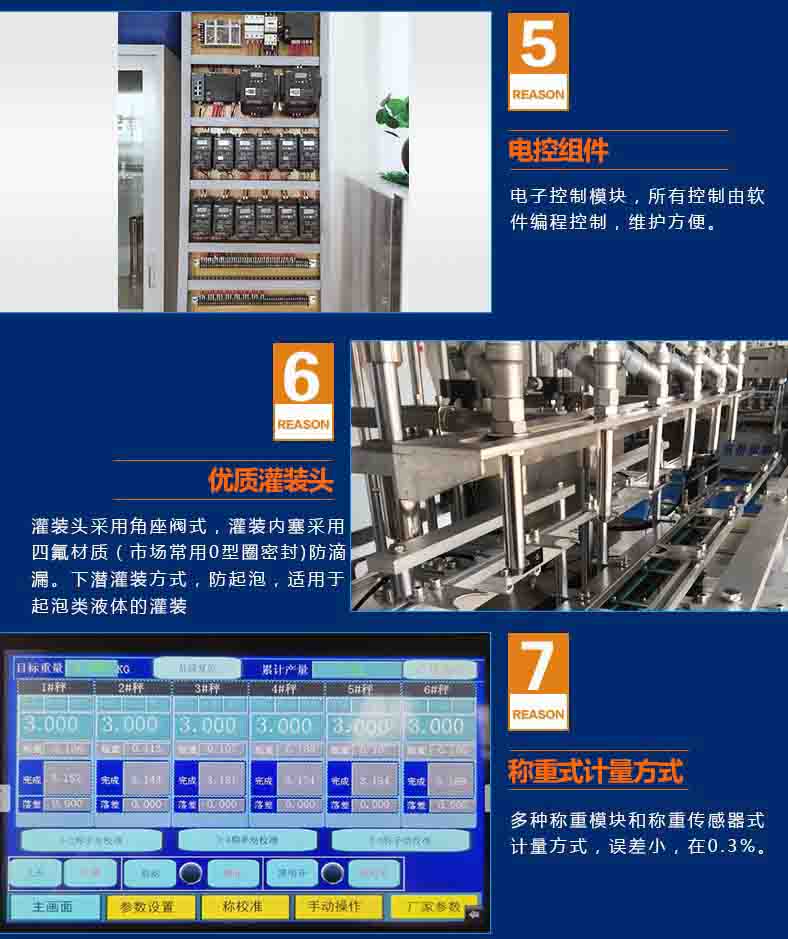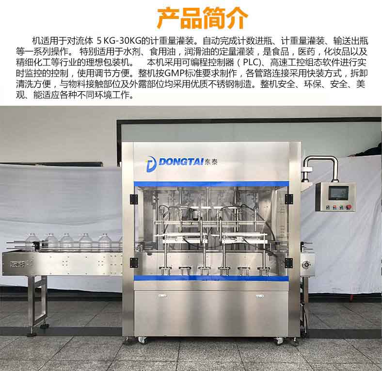 本機(jī)適用于對流體5kg-30kg的計(jì)重量灌裝。自動完成計(jì)數(shù)進(jìn)瓶、計(jì)重量灌裝、輸送出瓶等一系列操作。 特別適用于水劑、食用油,潤滑油的定量灌裝,是食品,醫(yī)藥,化妝品以及精細(xì)化工等行業(yè)的包裝機(jī)。本機(jī)采用可編程控制器(PLC)、高速工控組態(tài)軟件進(jìn)行實(shí)時監(jiān)控的控制,使用調(diào)節(jié)方便。整機(jī)按GMP標(biāo)準(zhǔn)要求制作,各管路連接采用快裝方式,拆卸清洗方便,與物料接觸部位及外露部位均采用優(yōu)質(zhì)不銹鋼制造。整機(jī)安全、環(huán)保、安全、美觀、能適應(yīng)各種不同環(huán)境工作。