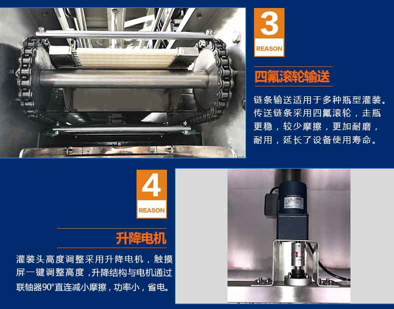 3.灌裝頭高度調(diào)整采用升降電機(jī),觸摸屏一鍵調(diào)整高度,升降結(jié)構(gòu)與泵通過聯(lián)軸器90°直連減小摩擦,功率小,省電;