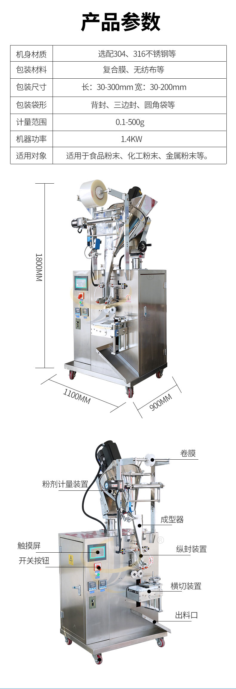 適用于食品行業(yè)、日用品行業(yè)、生活用品行業(yè)。餐飲用品等行業(yè)產品包裝如三七超細粉、奶粉、豆粉、中藥粉、調料粉、雞精、鹽、砂糖、等產品。