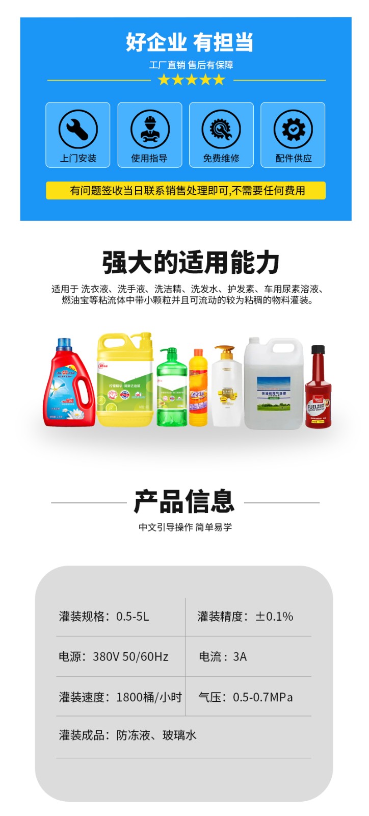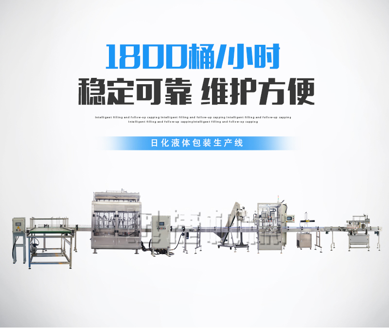 日化液體包裝生產線適用于洗衣液、洗手液、洗潔精、燃油寶等粘流體中帶小顆粒并且可流動的較為粘稠的物料灌裝。