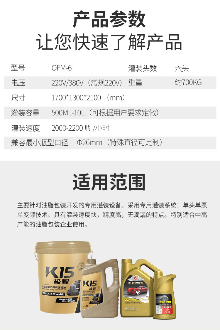 全自動(dòng)六頭稱(chēng)重潤(rùn)滑油灌裝機(jī)主要針對(duì)油脂包裝開(kāi)發(fā)的專(zhuān)用灌裝設(shè)備。采用專(zhuān)用灌裝系統(tǒng):?jiǎn)晤^單泵單變頻技術(shù)。具有灌裝速度快