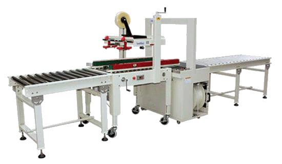 封箱機(紙箱膠帶封口)+高解析噴碼機(日期、批號、廠名等信息噴印打碼設(shè)備)+自動打包機(自動打出兩道PP帶。進行紙箱捆扎包裝)