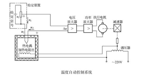 如果將控溫過(guò)程中的人工操作 (檢測(cè)和調(diào)節(jié)) 換由自動(dòng)控制裝置完成,則成為包裝機(jī)自動(dòng)控溫系統(tǒng)。如下圖所示,檢測(cè)元件熱電偶檢測(cè)恒溫箱內(nèi)的溫度,并將溫度轉(zhuǎn)換為對(duì)應(yīng)的電壓信號(hào)2 ,同時(shí)反饋給比較器。比較器比較表示給定溫度的給定電壓信號(hào)1與檢測(cè)電壓信號(hào)2的大小,得到溫差信號(hào),其大小和正負(fù)代表溫差的大小和方向。溫差信號(hào)△經(jīng)電壓放大和功率放大后,控制執(zhí)行電機(jī)的轉(zhuǎn)速和方向,執(zhí)行電機(jī)通過(guò)傳動(dòng)裝置拖動(dòng)調(diào)壓器觸頭調(diào)節(jié)供熱電壓。當(dāng)溫度偏高時(shí),動(dòng)觸頭向著減小電壓( 電流)方向轉(zhuǎn)動(dòng); 反之,當(dāng)溫度偏低時(shí),動(dòng)觸頭則向著增大電壓( 電流)方向運(yùn)動(dòng),直至恒溫箱內(nèi)溫度達(dá)到給定溫度,溫差信號(hào)△=0 時(shí)觸頭停止運(yùn)動(dòng)。