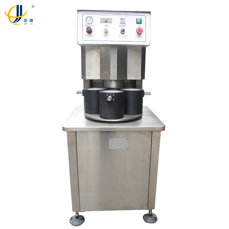3、在真空室上升的過(guò)程中,位于真空室驅(qū)動(dòng)氣缸上的傳感器能檢測(cè)到真空室已經(jīng)接近密封墊圈,機(jī)頭上的真空切換閥會(huì)及時(shí)打開(kāi)。蓋子吸在旋蓋盤(pán)下,瓶子位于托盤(pán)中心,都處于密閉的真空室內(nèi)部。真空閥切換后真空室和真空泵管道聯(lián)通,與真空室聯(lián)通的還有真空壓力傳感器,會(huì)實(shí)時(shí)地向機(jī)器程序控制器反饋真空室內(nèi)真空度壓力數(shù)值。